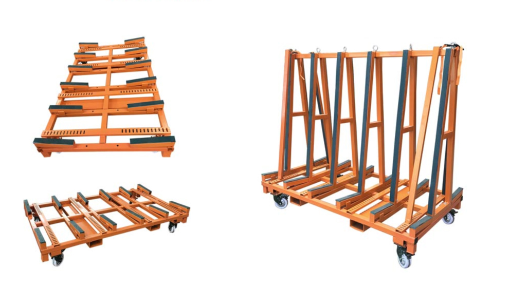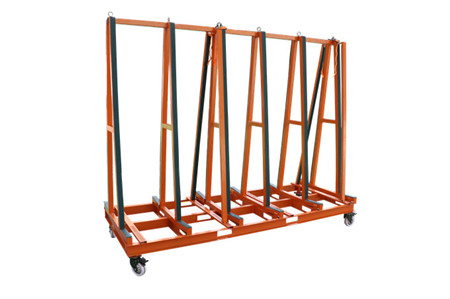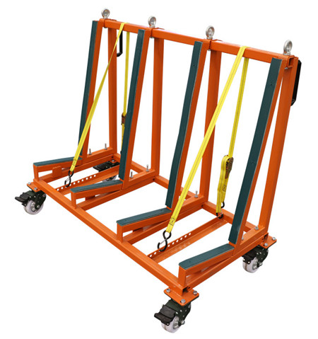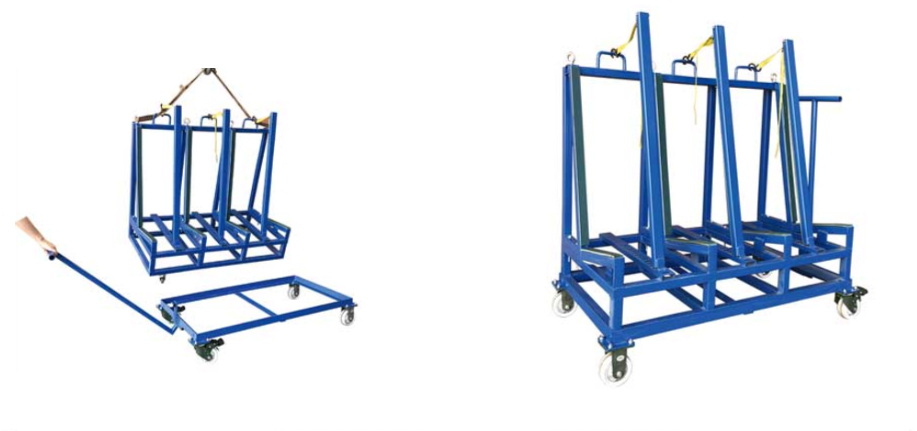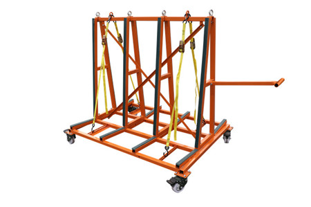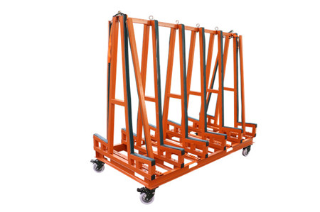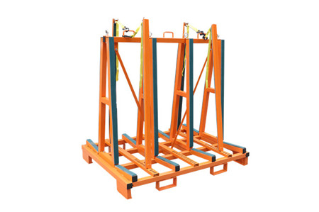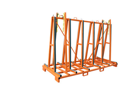 The transport frames are designed for delivering heavy sheets of glass and stone to construction sites where a strong, heavy frame is needed to lift the complete load and frame together onto building sites. The fully loaded frame can easily be moved around the floors on different levels of construction sites.